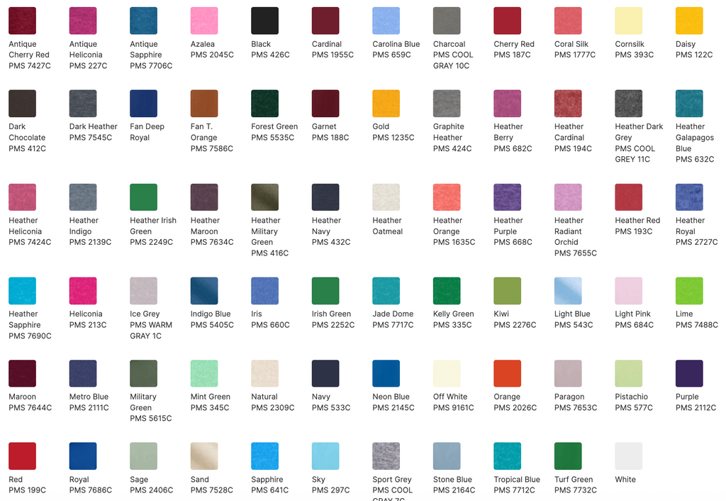 - 65/35 poly/ring spun cotton (Dark Heather, Heather Berry, Heather Cardinal, Heather Galapagos Blue, Heather Heliconia, Heather Indigo, Heather Irish Green, Heather Maroon, Heather Military Green, Heather Navy, Heather Orange, Heather Purple, Heather Radiant Orchid, Heather Royal, Heather Red and Heather Sapphire)